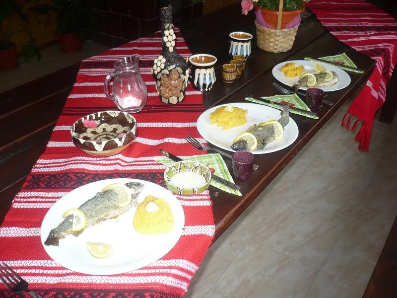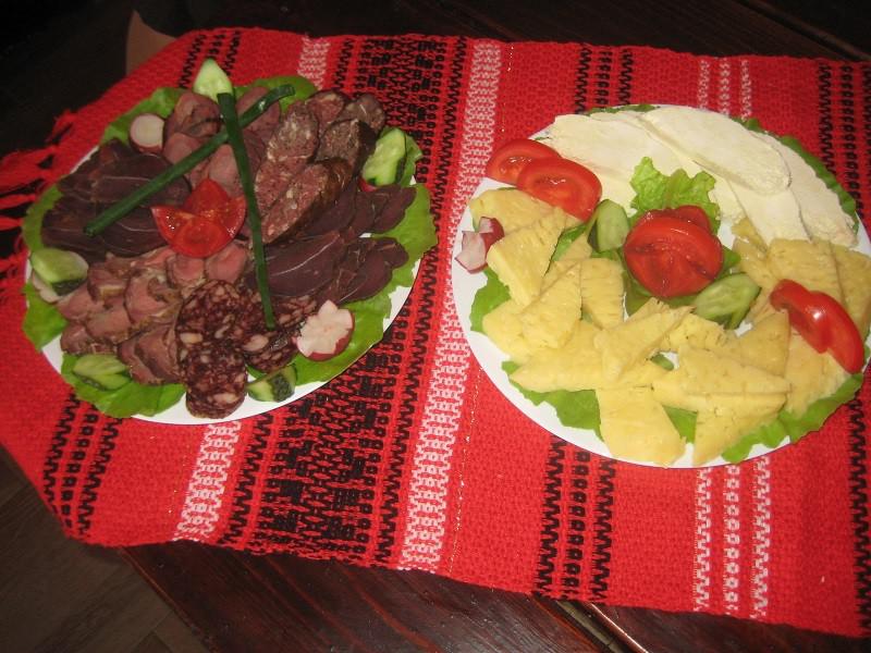 Va puteti indestula cu platoul ciobanului care cuprinde branzeturi si mai multe feluri de pastramuri facute in casa, gratar, ceaun de mistret , carne de vitel in jantuit, pastrav cu mamaliguta, balmos, deserturi, prajituri de casa si alte produse direct de la stana.