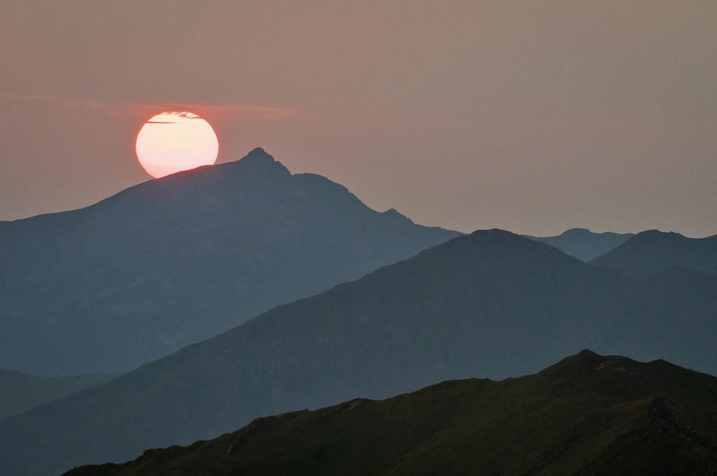 • Un apus de soare de pe vârful Ineu, peste întreaga creastă a Munților Rodnei.